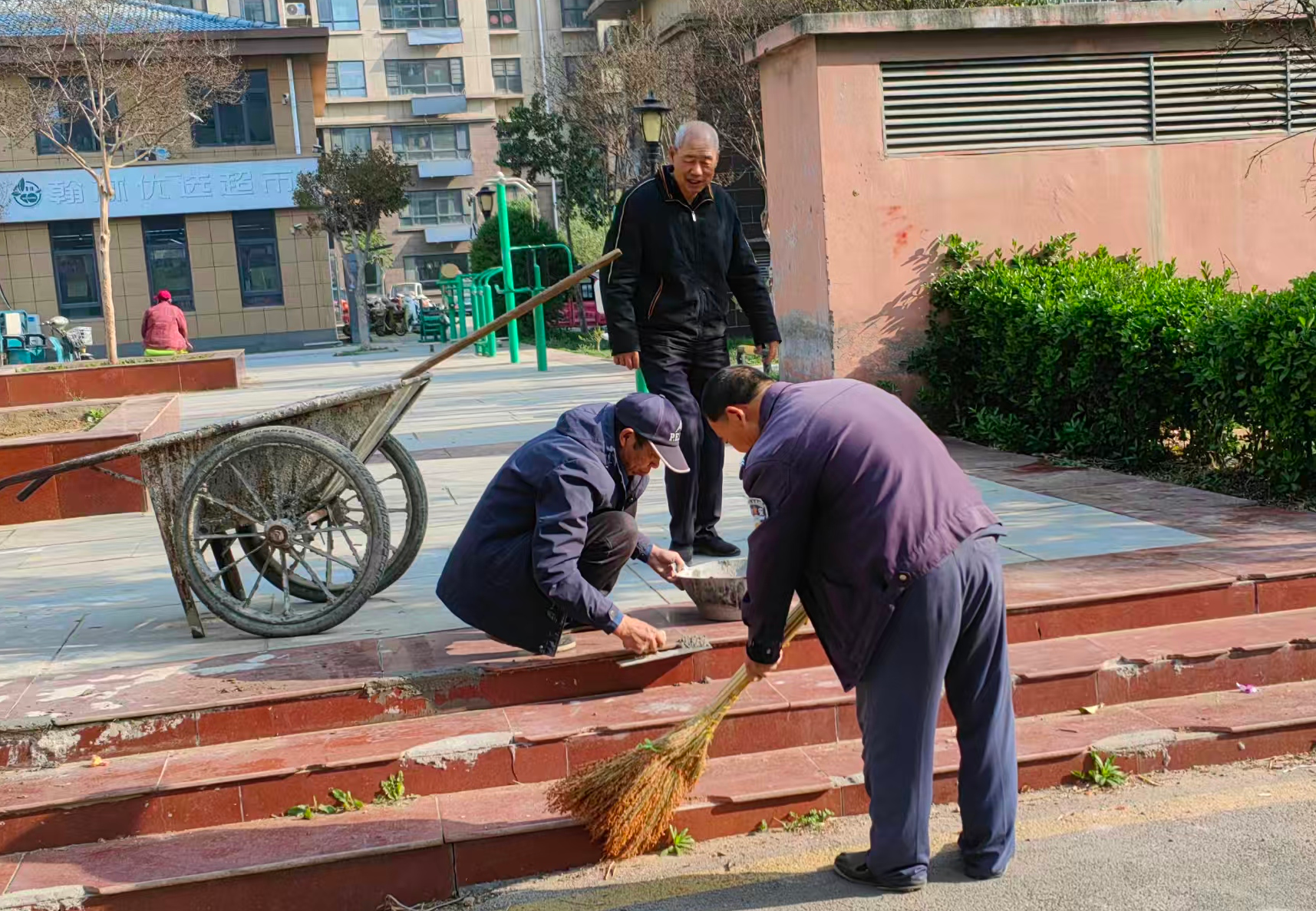 前期,社区工作人员在日常巡查中发现部分台阶出现破损、缺口、松动等问题,不仅影响小区环境美观,更存在绊倒、摔伤等安全隐患。社区第一时间安排施工人员对破损台阶进行清理、填补、加固,对缺口部位细致修整抹平,确保台阶平整牢固、通行安全。