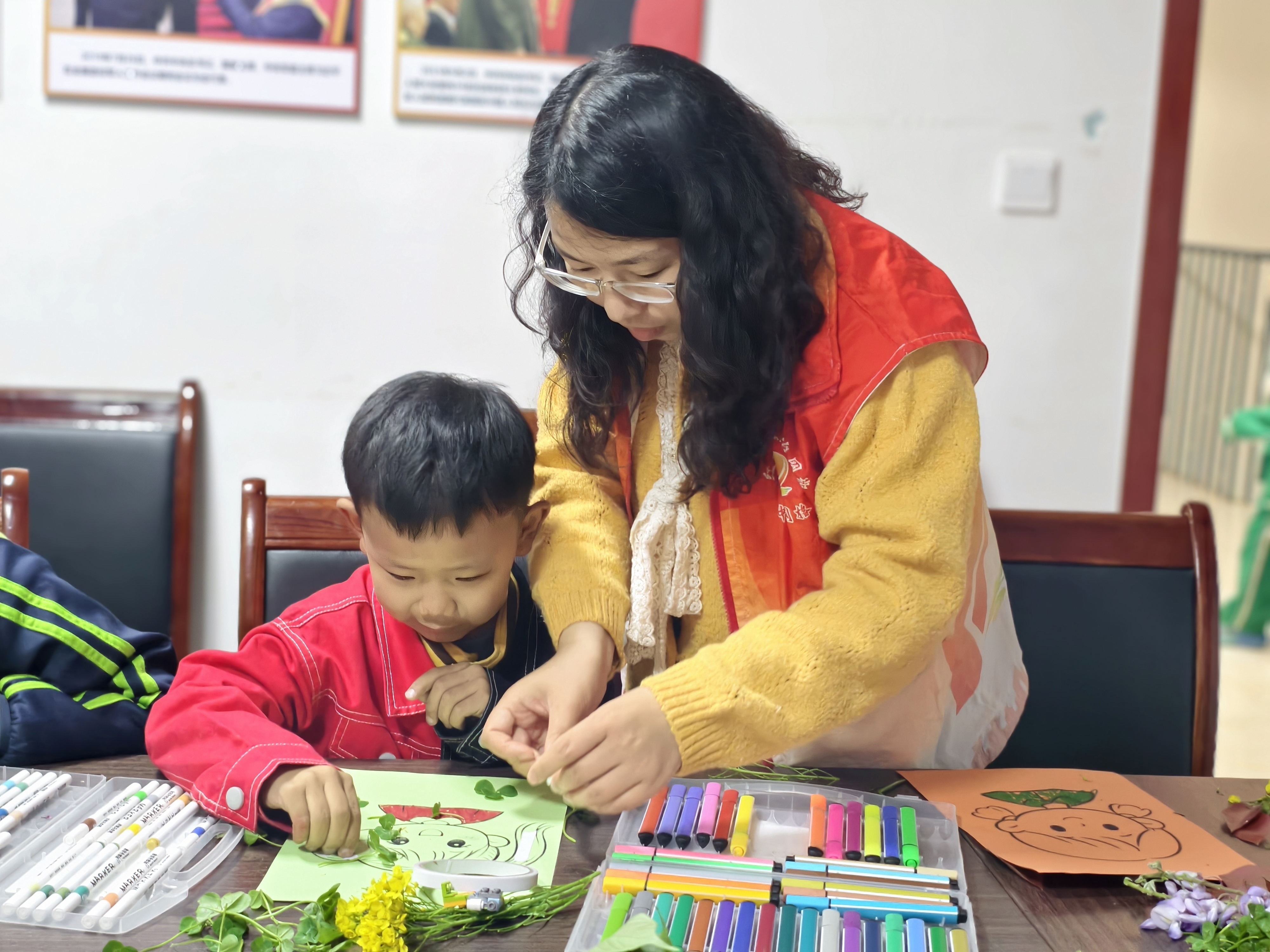 活动现场暖意融融、氛围欢快。社区工作人员提前为孩子们准备了画纸、彩笔、颜料以及各类新鲜花草、彩纸等丰富的手工材料,耐心向孩子们讲解创作步骤与技巧。本次手工创作以春日为主题,孩子们先在画纸上勾勒出可爱的儿童肖像,随后拿起彩笔认真涂色,用缤纷色彩勾勒出心中童真模样。