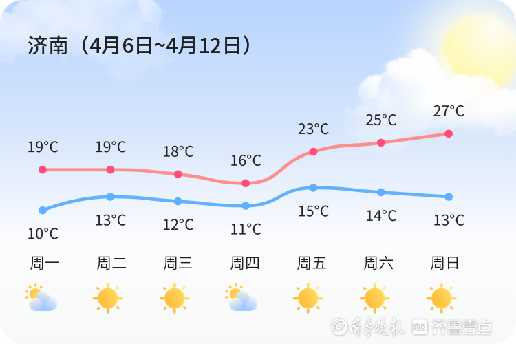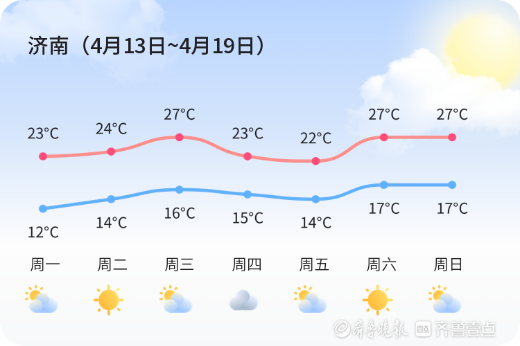 全市周平均最高温21℃,平均最低温12℃,平均气温16℃,周最高气温27℃,出现在周日,周最低温10℃,出现在周一。