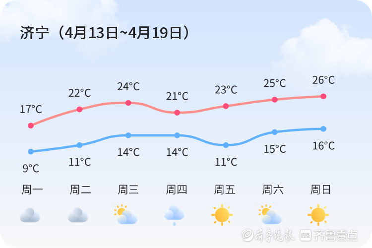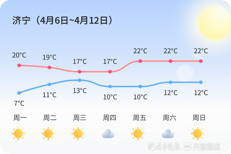 全市周平均最高温19℃,平均最低温10℃,平均气温15℃,周最高气温22℃,出现在周五、周六、周日,周最低温7℃,出现在周一。