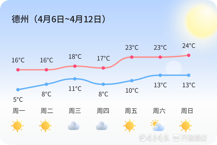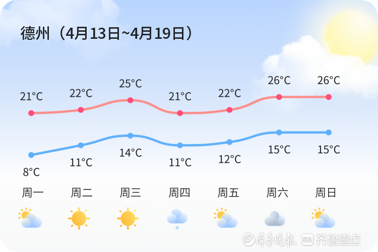 全市周平均最高温23℃,平均最低温12℃,平均气温17℃,周最高气温26℃,出现在周六、周日,周最低温8℃,出现在周一。