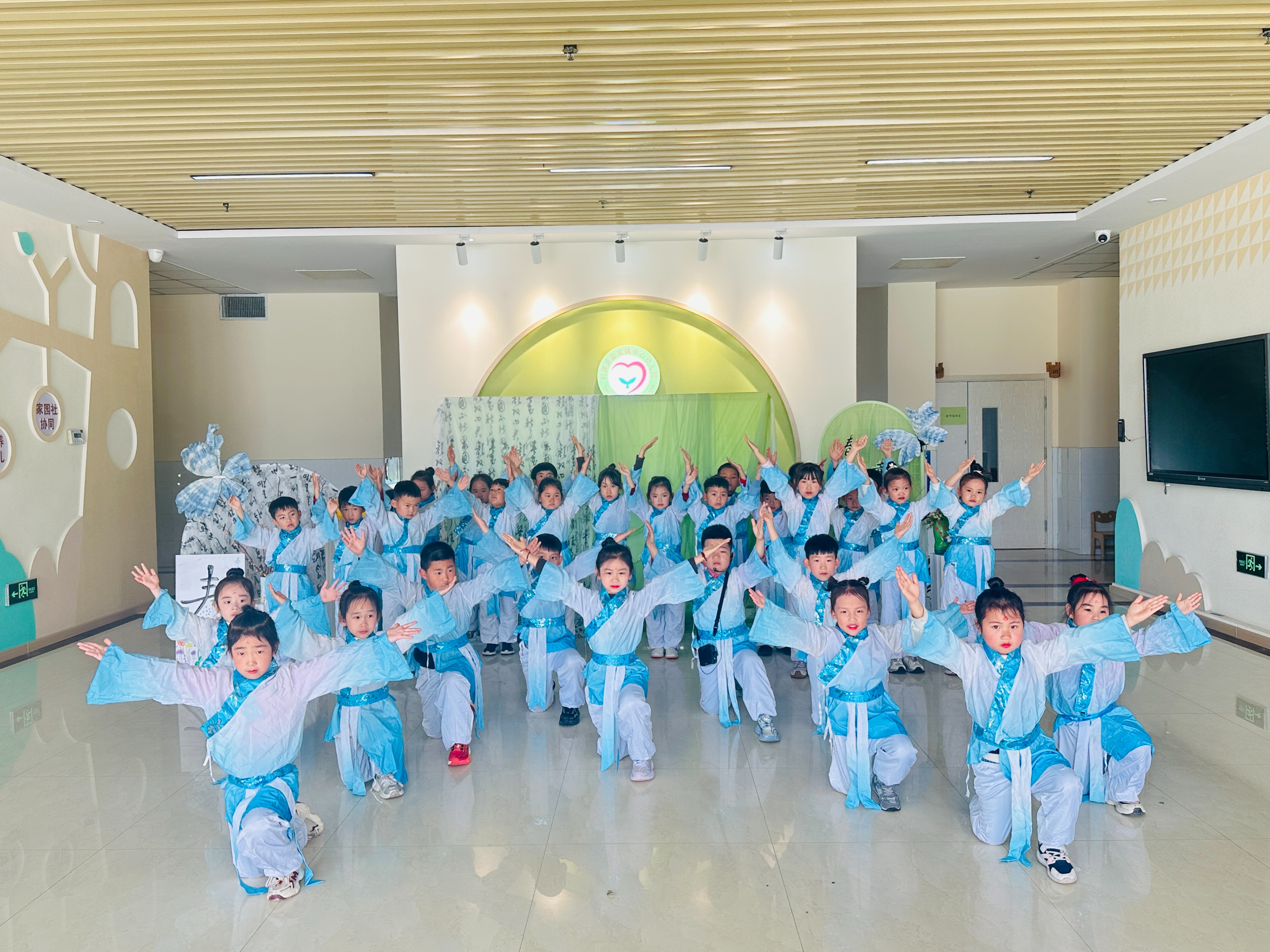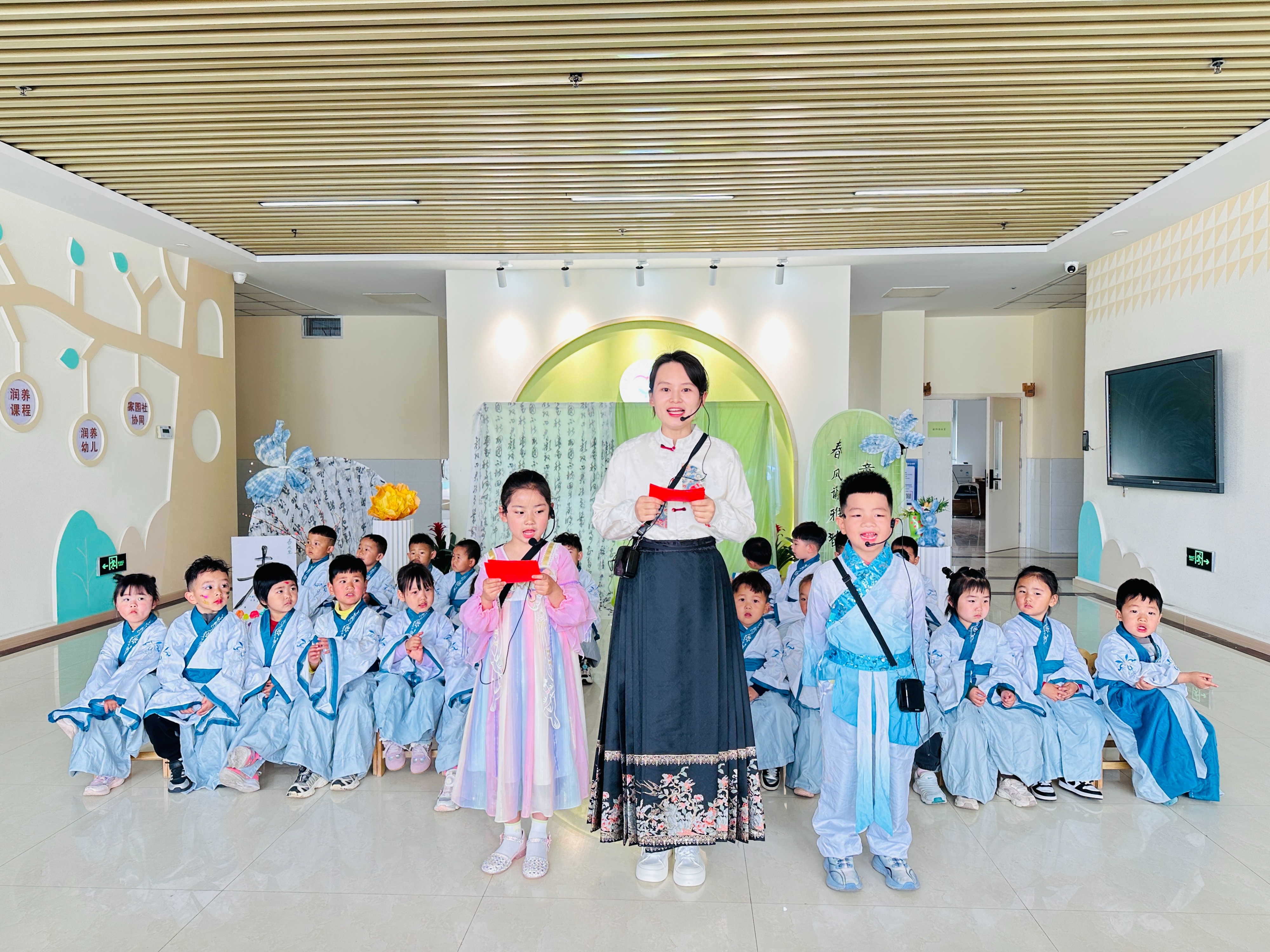 活动由一名教师、两名幼儿共同主持,稚嫩又大方的开场,拉开了赛诗会的序幕。各班幼儿依次登台,身着整齐服装,精神抖擞地吟诵春日的经典诗词。
