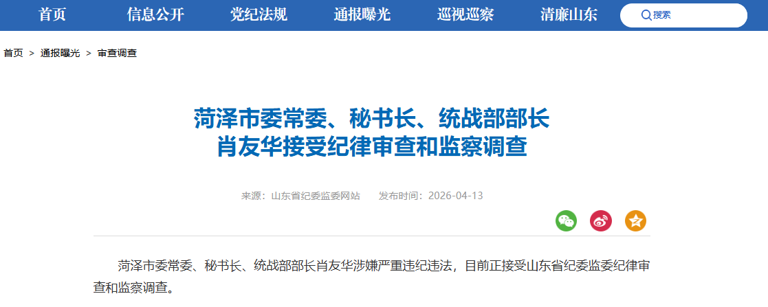 菏泽市委常委、秘书长、统战部部长肖友华被查打虎拍蝇猎狐 | 2026-04-13 17:15:45 微信扫码扫码下载客户端4月13日,据山东省纪委监委网站消息:菏泽市委常委、秘书长、统战部部长肖友华涉嫌严重违纪违法,目前正接受山东省纪委监委纪律审查和监察调查。 责任编辑:李思羽