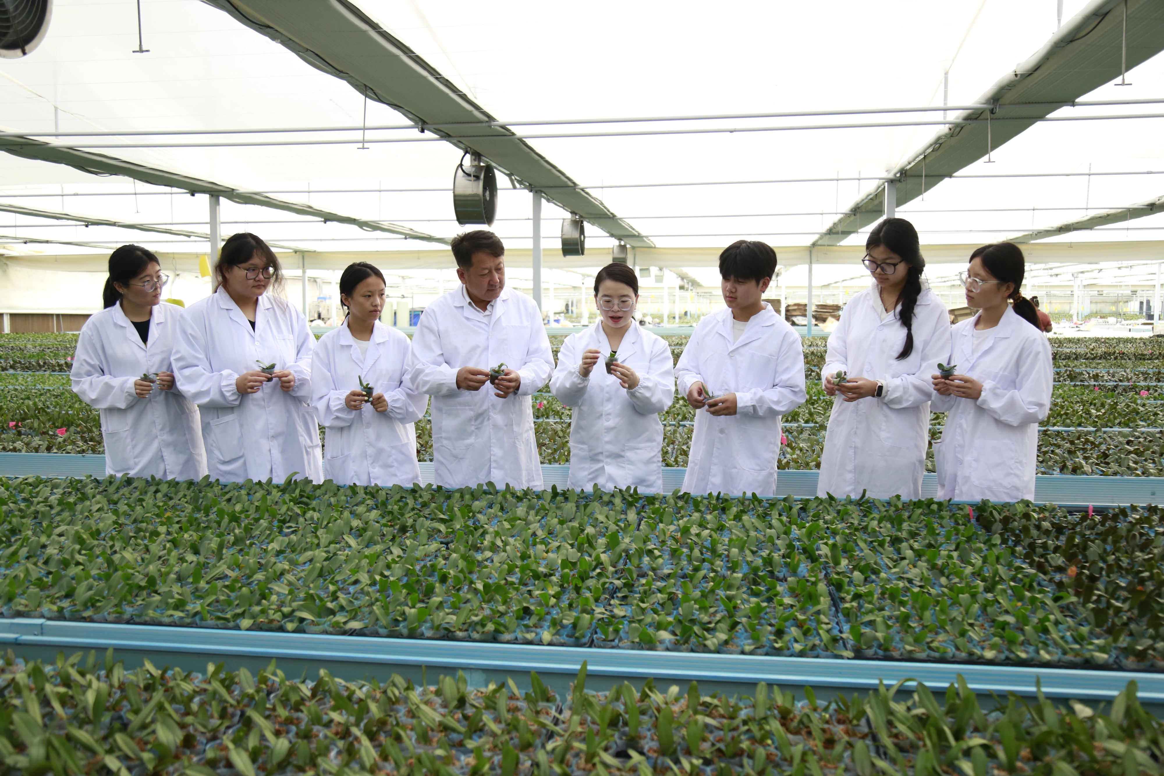 “王教授,我家蝴蝶兰大棚叶片发黄了!”这样的求助电话,学院专家时常接到,总是第一时间赶赴现场解决。从新品种选育、绿色病虫害防控,到节水节肥栽培、鲜花采后保鲜,专家团队把专业技术转化为花农易学易用的实操方法,全程跟进解难题。
