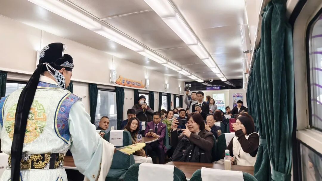 领导一行首先观看了极具山东特色的吕剧表演,随后深入各节特色车厢,逐一走访协会企业的展示摊位。