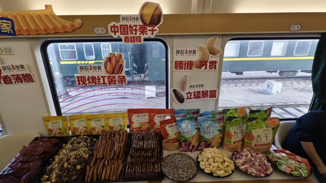 在特色美食餐车(10号车厢)薛记炒货现场摆出了“排队王”现烤红薯条、香脆坚果与猪肉脯,香气四溢。