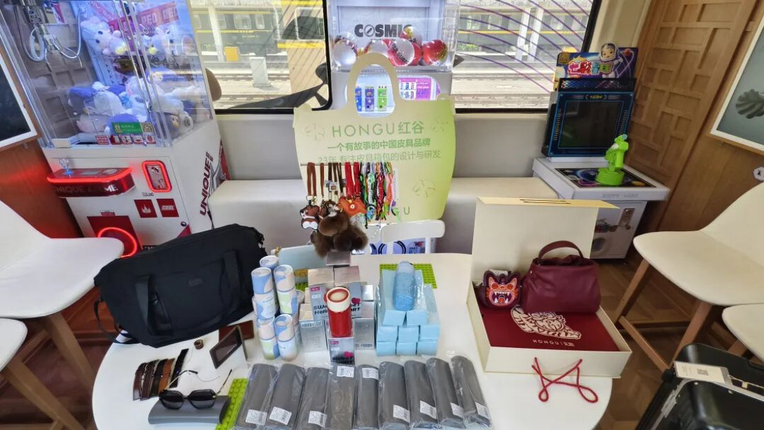 红谷皮具则展示了各式箱包、旅行包、防晒伞及精美水杯,满足旅客的出行美学需求。