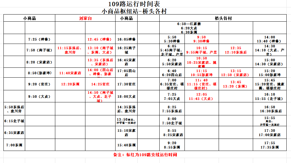 调整后的109路实行“高峰保障、平峰补充”运营模式:早晚高峰时段保持原有的一级线路运营标准,重点保障市民刚性通勤出行需求,小商品枢纽站上午运营时间为05:50-09:50、下午14:35-18:00,桥头枢纽站上午05:50-09:20、下午14:00-17:55,线路等级为一级,支持优惠换乘;平峰时段则开通109路支线,起讫点为刘家台村委至桥头各村,运营时间为刘家台村委11:15-14:50、桥头枢纽站9:50-13:45,线路等级为三级,同样享受优惠换乘政策,有效填补平峰时段桥头片区公交运力空白。