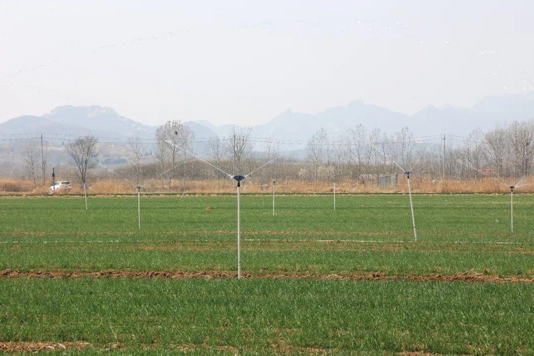 不一会儿,在工人的默契配合下,一根根崭新的喷灌杆在麦田里整齐矗立,均匀喷洒出细密水雾。设备投用后,只需一人开启水泵,即可实现全域自动化灌溉,无需专人值守看管。“过去浇地靠等雨、靠人力,现在随时开阀随时浇,半个月定期灌溉一次,麦苗长势比往年好太多。”赵金涛笑着说。