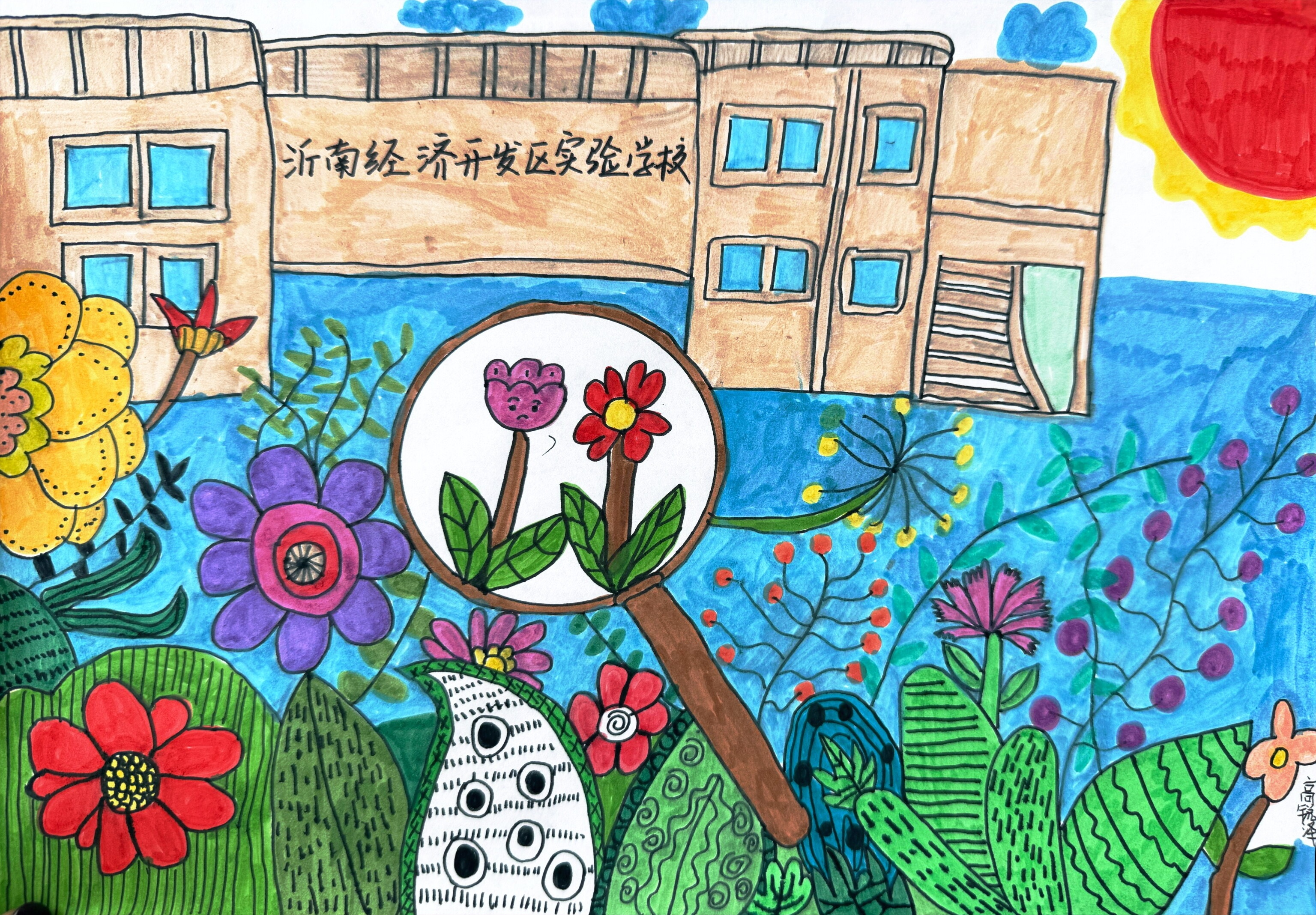 作者以校园为背景,用放大镜聚焦春日花草,展现了孩子们探索自然的好奇心。色彩明快的花朵、形态各异的绿植与温暖的阳光,既描绘了校园春日生机,也传递出亲近自然、热爱观察的童真与活力,充满童趣与希望。