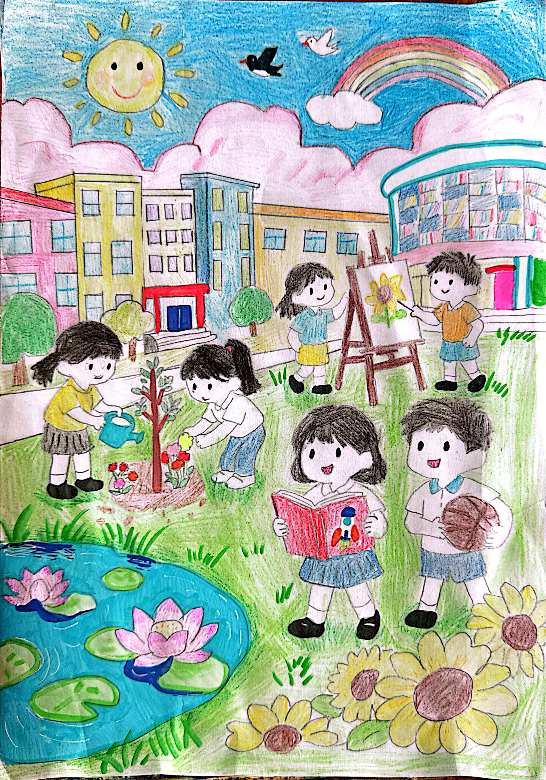 作者用明快的色彩,勾勒出春日校园里生机盎然的模样。湛蓝的天空中,挂着笑眯眯的太阳,彩虹与飞鸟点缀其间,云朵也染上了温柔的粉晕。教学楼错落有致,玻璃窗在阳光下闪着光,诉说着知识的温度,满是春日的希望与美好。