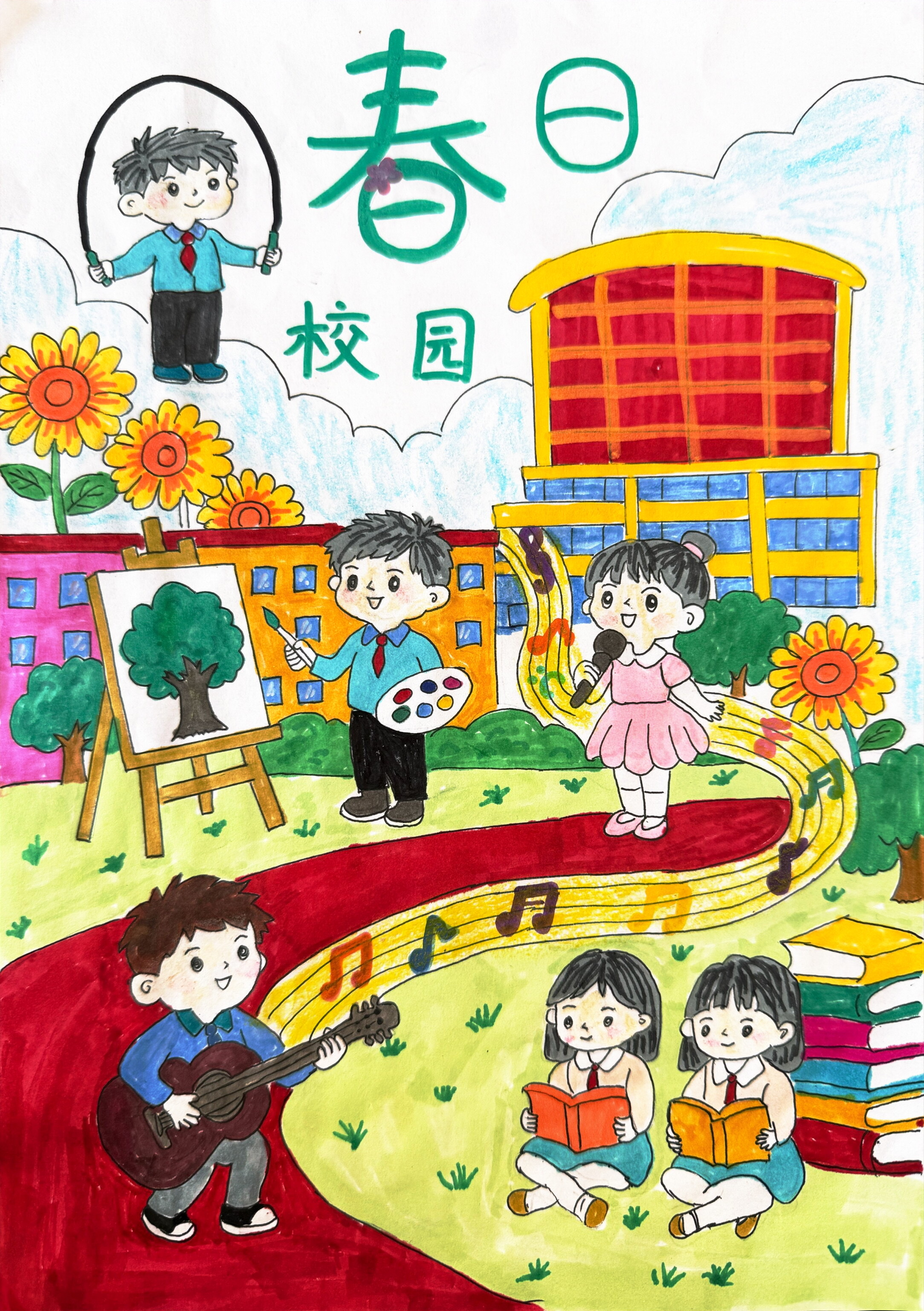 作品以明快色彩勾勒出校园里的活力场景:孩子们在春日里跳绳、绘画、歌唱、弹吉他、阅读,向日葵与绿树点缀其间,音符与书本传递着知识与欢乐,生动展现了春日校园里少年们蓬勃向上、多才多艺的美好风貌。