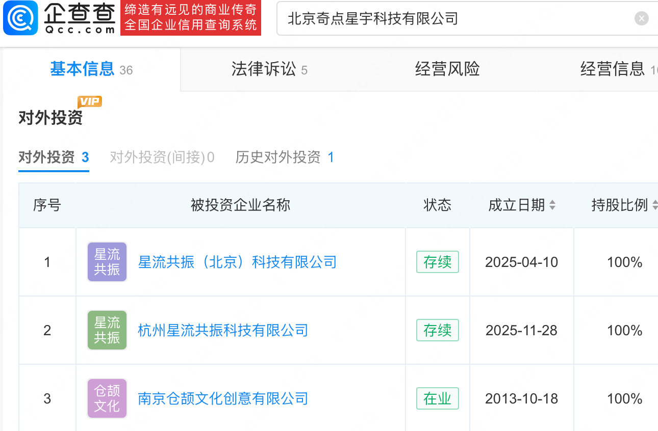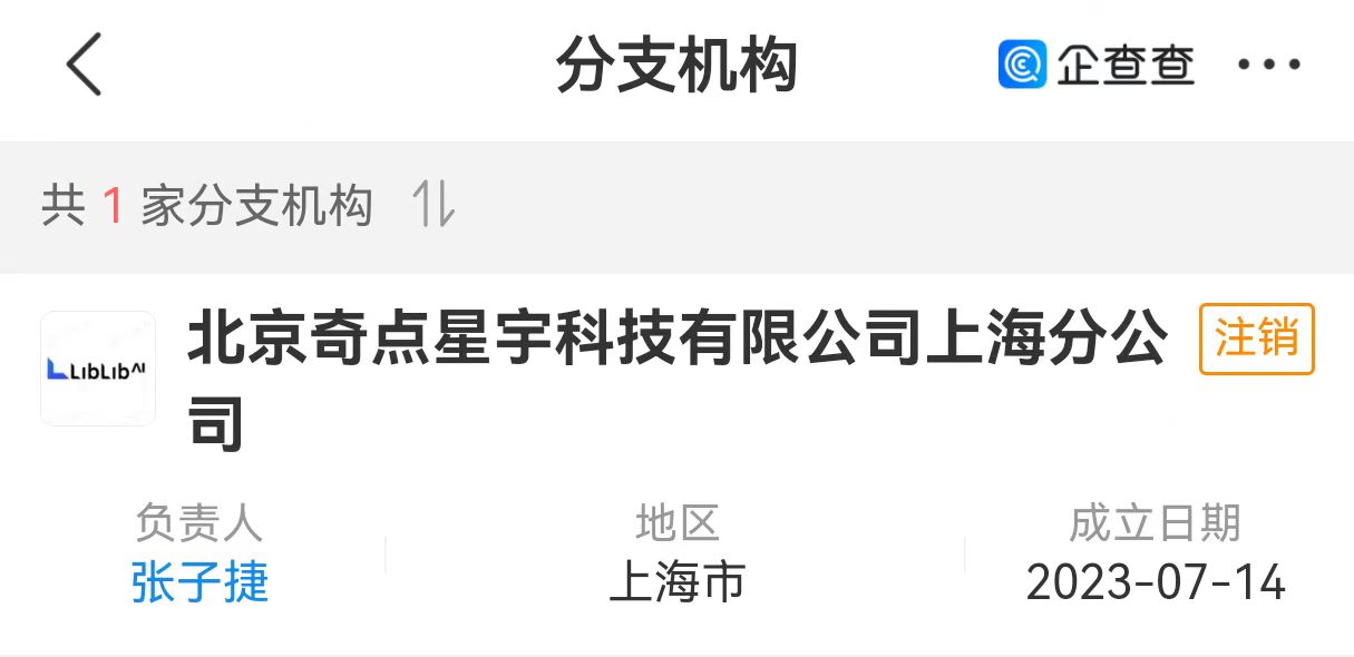 哩布哩布AI官网显示,其背后公司为北京奇点星宇科技有限公司。企查查APP显示,该公司成立于2023年5月,注册资本100万,含人工智能应用软件开发、人工智能基础软件开发、信息系统集成服务等业务。该公司现有3家对外投资公司,其唯一一家分支机构位于上海,目前已注销。
