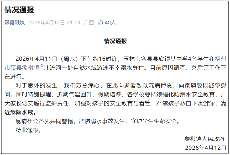 痛心!广西4名中学生下河游泳不幸溺亡综合新闻 | 2026-04-13 17:15:41 微信扫码扫码下载客户端广西梧州市藤县象棋镇人民政府4月12日通报,4月11日16时许,玉林市容县县底镇某中学4名学生在象棋镇北流河一处自然水域游泳不幸溺水身亡。目前,事故原因调查、善后等工作正在进行中。通报称,近期气温回升、假期增多,各学校要持续强化防溺水安全教育,广大家长切实履行监护责任,加强对孩子的安全教育与看管。责任编辑:李思羽