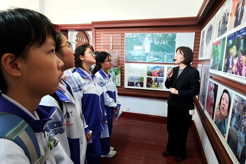 随后,五班学生走进蔡公时纪念馆。这座见证“五三惨案”的二层西式楼房,弥漫着凝重的历史气息。在纪念馆解说员的引导下,同学们开启沉浸式红色探寻。他们寻找烈士手书楹联,抄写触动心灵的语句,思考烈士家国情怀;凝视还原历史现场的雕塑,探讨交涉署人员宁死不屈的精神内涵;在“我的思考与担当”环节写下铮铮誓言,表达传承红色基因、担当强国使命的决心。观看蔡公时烈士事迹专题片过程中,当得知蔡公时先生在日军酷刑下高呼“中国人可杀不可辱”的壮烈事迹时,不少同学红了眼眶,深刻认识到和平生活来之不易,作为新时代学生,必须铭记历史、砥砺前行。同学们向蔡公时烈士铜像敬献鲜花,全体同学鞠躬默哀致敬。