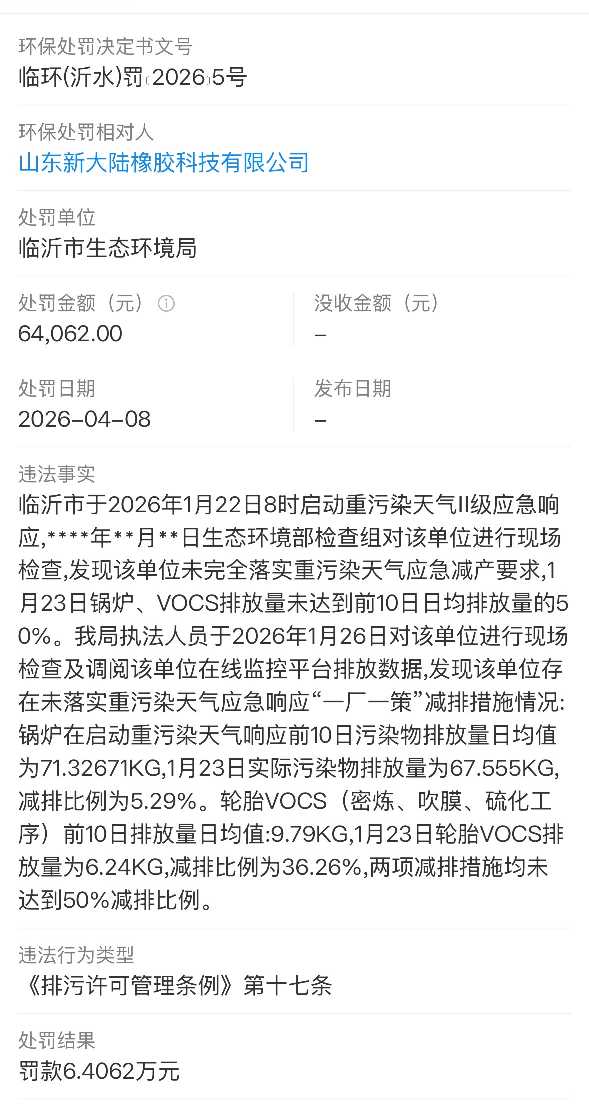 处罚决定显示,临沂市于2026年1月22日8时启动重污染天气Ⅱ级应急响应,生态环境部检查组对该单位进行现场检查时,发现该单位未完全落实重污染天气应急减产要求,1月23日锅炉、VOCS排放量未达到前10日日均排放量的50%。