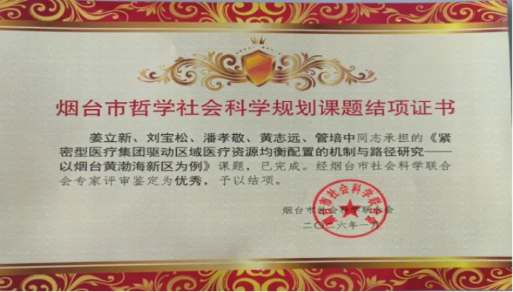 近日,烟台市社会科学联合会公布2025年度哲学社会科学规划课题结项评审结果,由烟台业达医院教授姜立新领衔的《紧密型医疗集团驱动区域医疗资源均衡配置的机制与路径研究——以烟台黄渤海新区为例》顺利结项,并荣获“优秀”等次。这是继该团队承担的省级卫生健康政策研究课题荣获山东省卫健委三等奖后,在医疗集团建设研究领域取得的又一项重要成果。