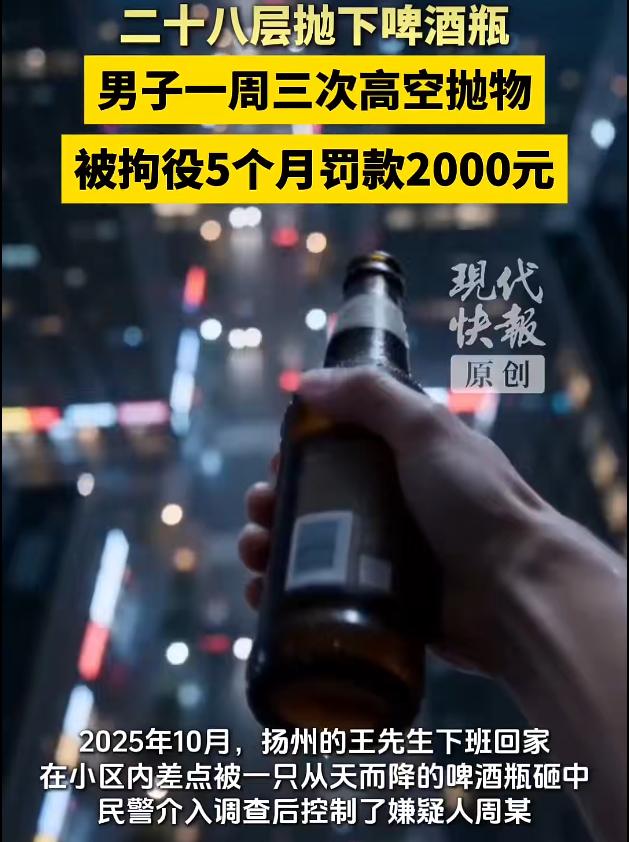 男子一周3次从28楼高空抛物,法院以高空抛物罪判拘役5个月罚金2000元