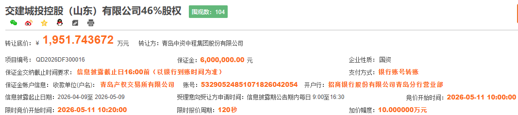 底价约1952万元!交建城投控股(山东)有限公司46%股权拟转让