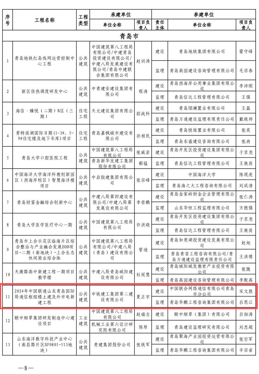 近日,山东省住房和城乡建设厅公示2025 年度山东省建设工程结构质量评价结果,由中国联通投资建设的2024年中国联通山东青岛国际局通信枢纽楼土建及外市电新建工程,凭借卓越的结构安全性能、精湛的施工工艺水平、严格的全过程质量管控及突出的技术创新能力,成功通过专家严苛审核,荣获“山东省优质结构工程”称号。