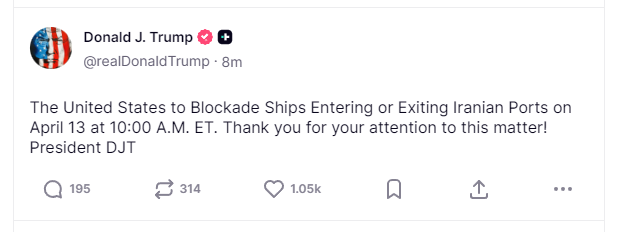 美东时间13日凌晨,美国总统特朗普在个人社交媒体平台上再次发声称,美国将于美国东部时间4月13日上午10时对进出伊朗港口的船只实施封锁。在美国和伊朗谈判未果后,美国总统特朗普12日表示,他并不在乎伊朗是否重返谈判桌,称美国将于美国东部时间13日10时对伊朗实施封锁,对北约在伊朗战事中不支持美国很失望。(央视新闻)