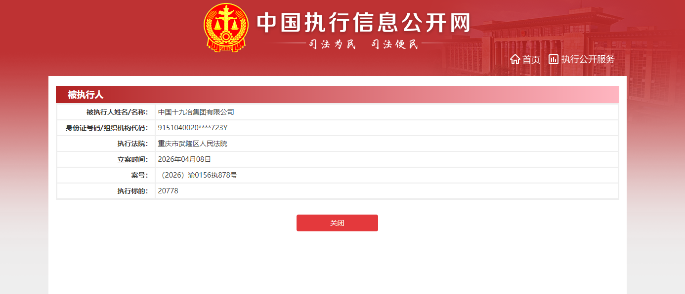 中国十九冶集团新增被执行人信息 执行标的20778元