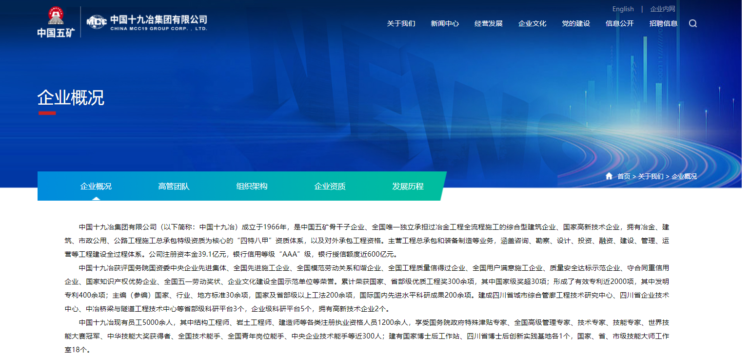 公开资料显示,中国十九冶集团有限公司成立于1966年,是中国五矿骨干子企业、全国唯一独立承担过冶金工程全流程施工的综合型建筑企业、国家高新技术企业,拥有冶金、建筑、市政公用、公路工程施工总承包特级资质为核心的“四特八甲”资质体系,以及对外承包工程资格。主营工程总承包和装备制造等业务,涵盖咨询、勘察、设计、投资、融资、建设、管理、运营等工程建设全过程体系。公司注册资本金39.1亿元,银行信用等级“AAA”级,银行授信额度近600亿元。