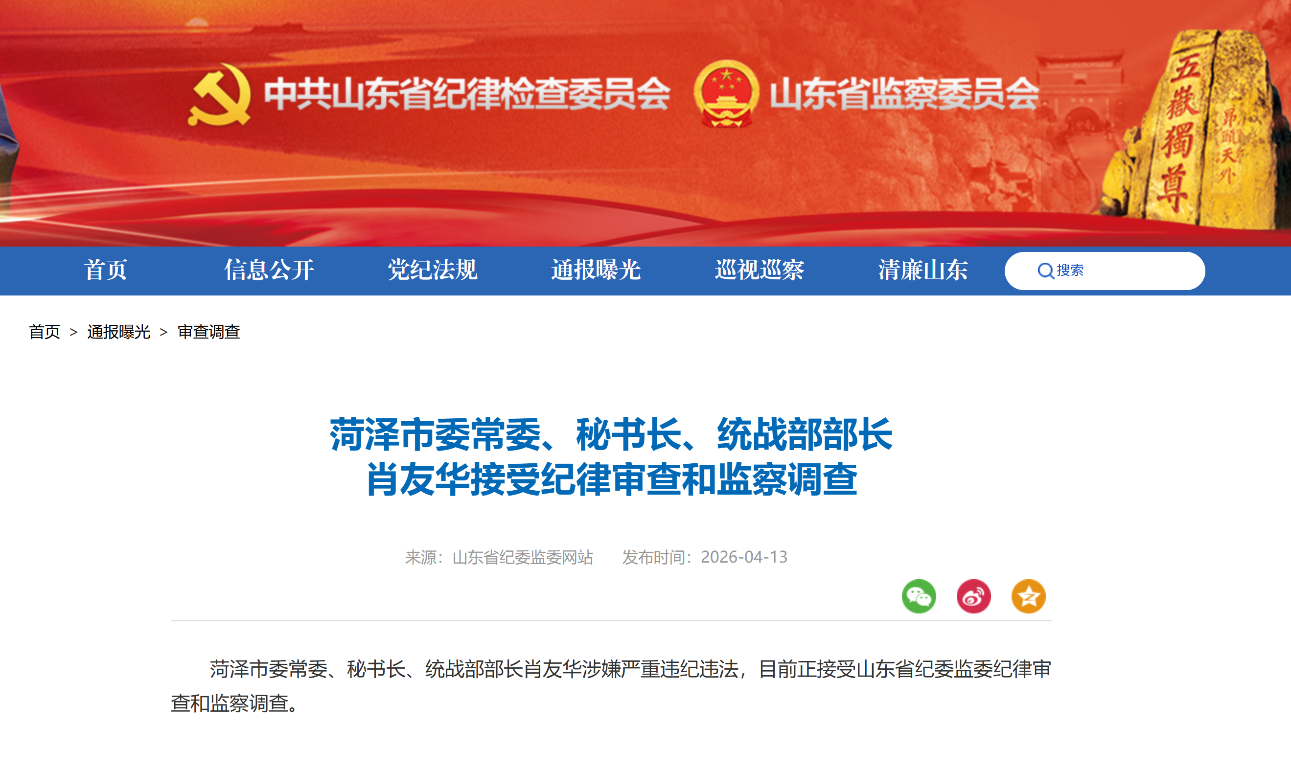 菏泽市委常委、秘书长、统战部部长肖友华接受审查调查观政 | 2026-04-13 14:40:14 原创范佳来源:齐鲁晚报·齐鲁壹点客户端微信扫码扫码下载客户端山东省纪委监委网站4月13日消息,菏泽市委常委、秘书长、统战部部长肖友华涉嫌严重违纪违法,目前正接受山东省纪委监委纪律审查和监察调查。责任编辑:范佳