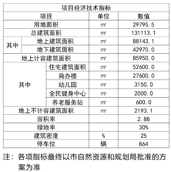 项目用地面积29795.5㎡,总建面131113.1㎡,地上建面88143.1㎡,住宅建面52600㎡,容积率2.88,绿地率30%,停车位864辆。项目规划建设11栋住宅(15~25层)、1座幼儿园,配建邻里坊、全民健身中心、养老服务站等配套设施。