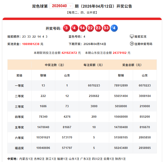 4月12日,双色球第2026040期开奖,红球号码:3、4、14、22、23、33,蓝球号码:4。当期中出一等奖13注,单注奖金607.02万元,广东3注,吉林、四川各2注,内蒙古、浙江、福建、山东、云南、陕西各1注。