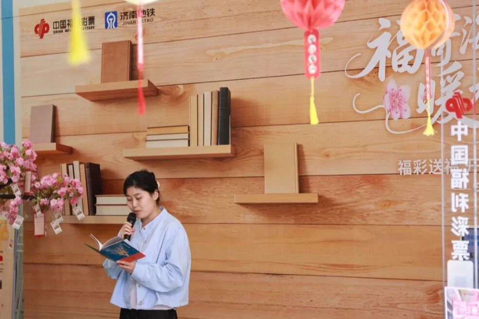 除了每天固定的站点打卡互动,活动期间还特别设置了两场与济南地铁联合开展的沉浸式活动,让春日的车厢和站台充满了艺术与书香。周五,在安成街站,“书香地铁 阅见泉城”活动温情上演。工作人员组织“读书分享”环节,邀请乘客聊一聊最近在读的一本书;最受欢迎的当属“你画我猜”游戏,参与者根据书名进行绘画或动作比划,笑声此起彼伏。书香浸润了车站,也点亮了泉城的春日出行。