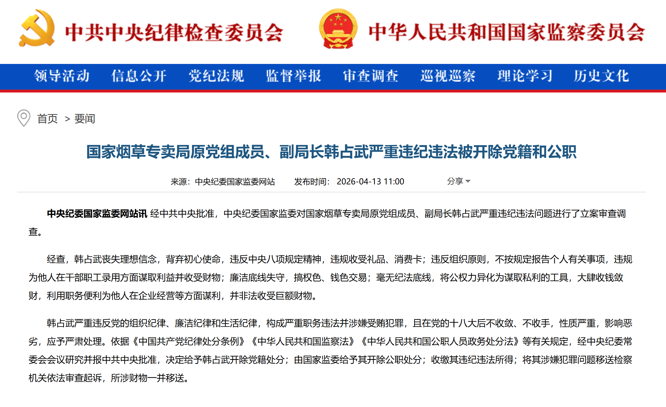 中央纪委国家监委网站4月13日消息,国家烟草专卖局原党组成员、副局长韩占武严重违纪违法被开除党籍和公职。