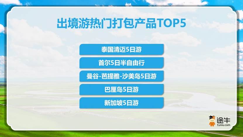 热门产品方面,5天行程的打包产品预订热度持续走高,其中,“泰国清迈5日游”“首尔5日半自由行”“曼谷-芭提雅-沙美岛5日游”“巴厘岛5日游”“新加坡5日游”等行程灵活,且兼顾观光体验与海滨休闲的线路是途牛用户更为热门的选择。