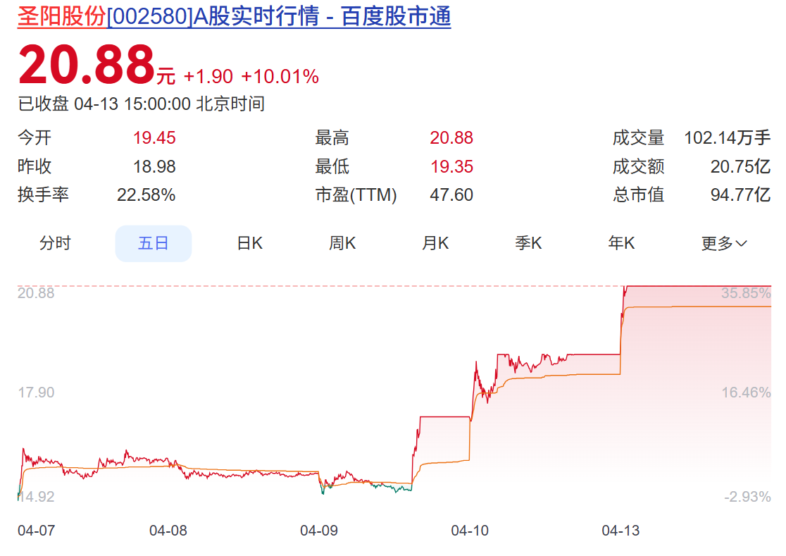 4月13日,圣阳股份(002580.SZ)开盘不久便涨停。截至收盘,圣阳股份报20.88元/股,上涨10.01%,换手率22.58%,已连续3个交易日涨停,累计涨幅33.16%,最新A股总市值达94.77亿元。