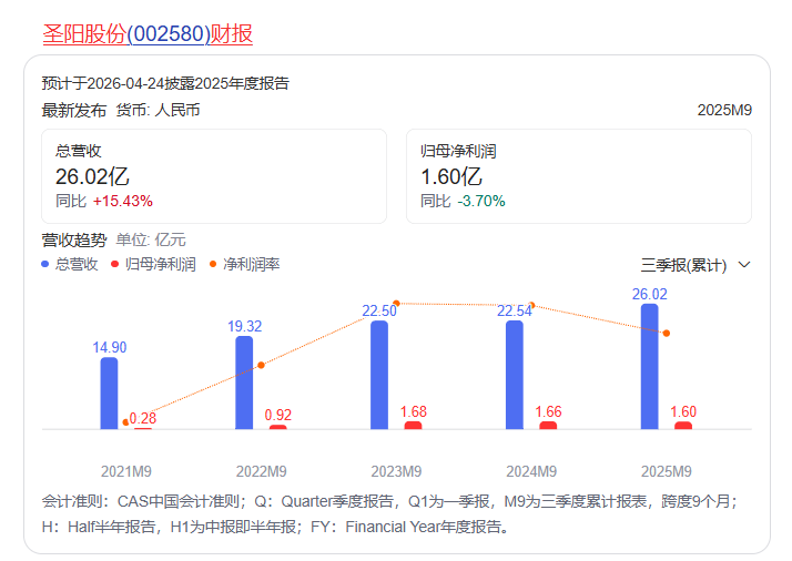 财务数据显示,2025年前三季度,圣阳股份实现营业总收入26.02亿元,同比上涨15.43%,已连续5年上涨;归母净利润为1.60亿元,同比下降3.70%。