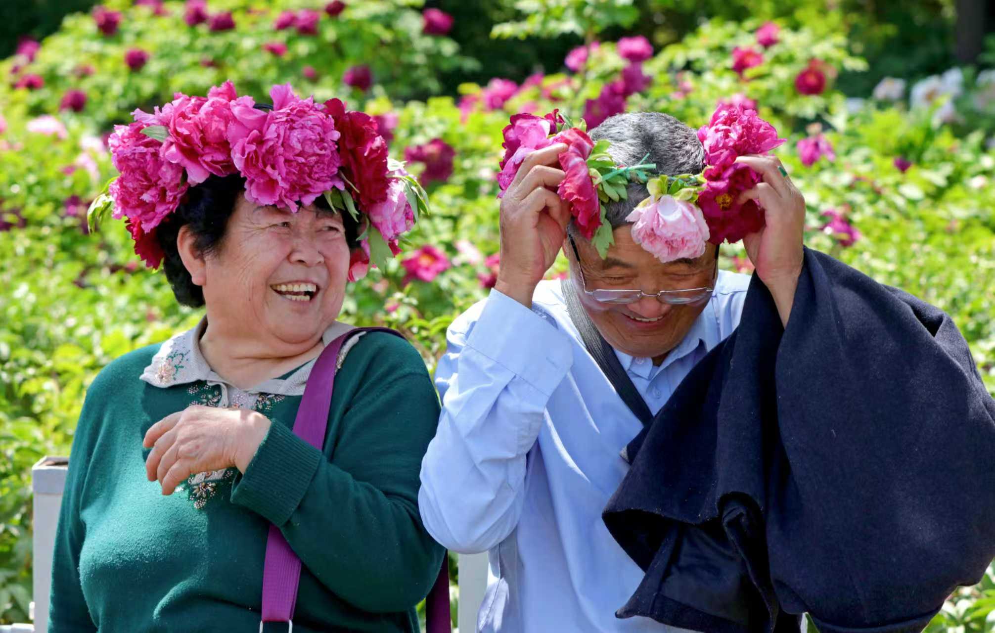 作品说明:在菏泽市曹州牡丹园,两位前来观赏牡丹的夫妇俩休息时,买了两个牡丹花编的花环戴在头上,左边的大妈看到丈夫不断地调整头上的花环时,两人都露出会心地微笑,仿佛展现了这对夫妻一路走来的点点滴滴,以及此刻享受生活、珍惜彼此的美好心境。