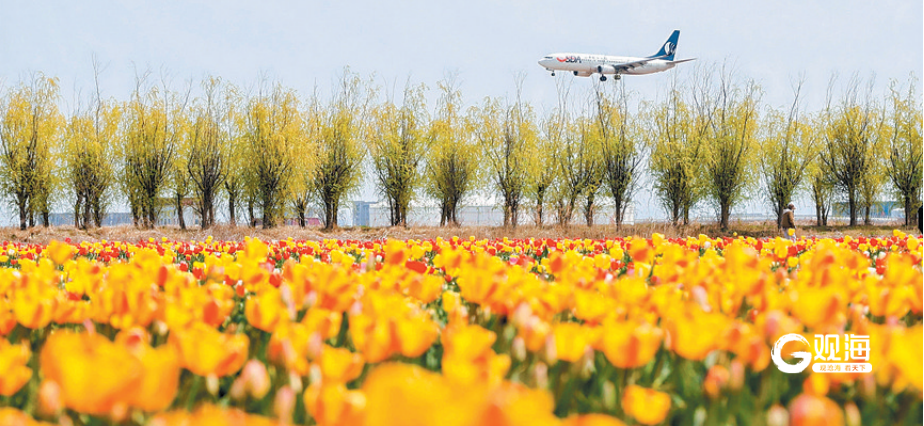 飞机从郁金香花海上方低空掠过,定格独属于青岛空港的春日浪漫。