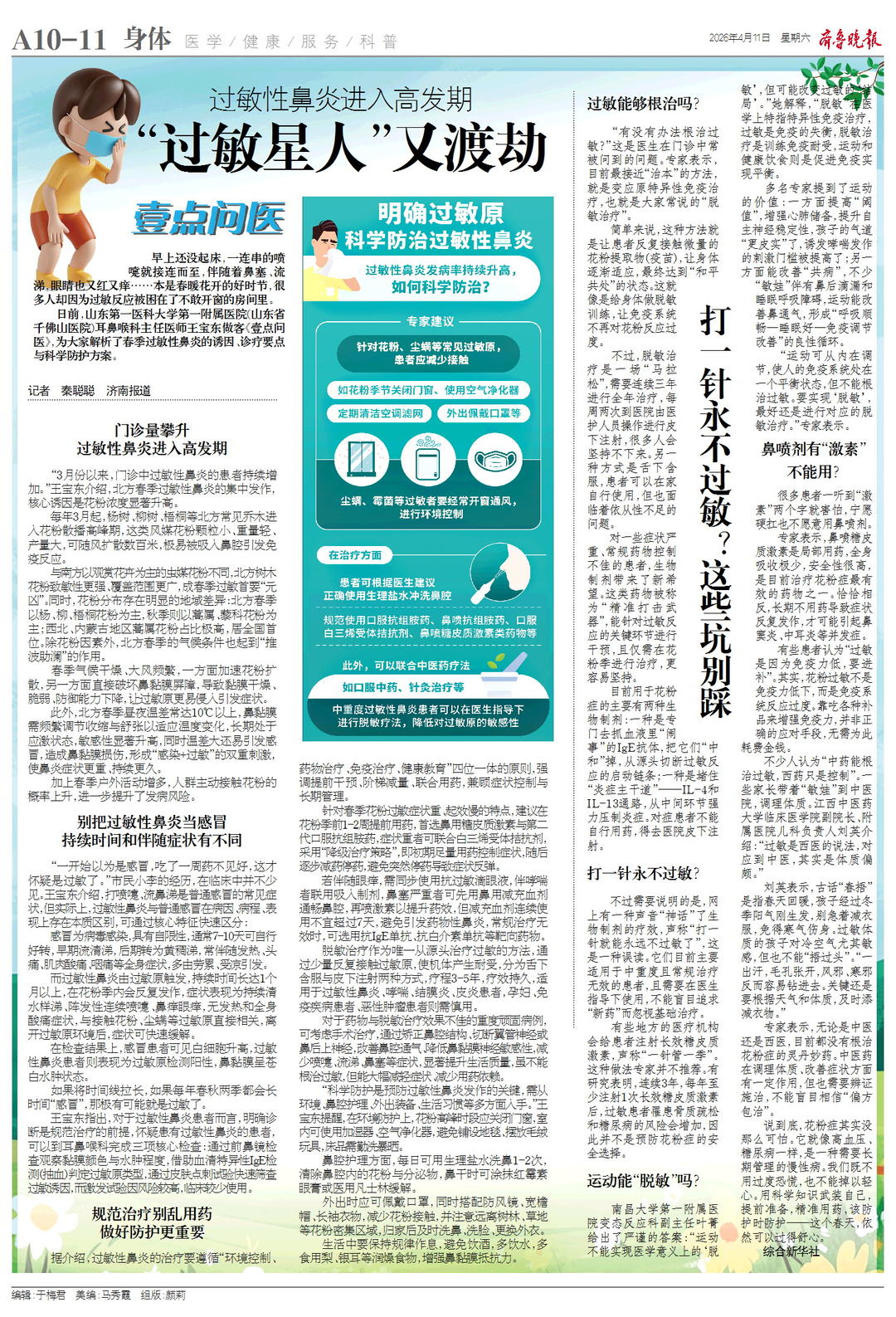 “科学防护是预防过敏性鼻炎发作的关键,需从环境、鼻腔护理、外出装备、生活习惯等多方面入手。”王宝东提醒,在环境防护上,花粉高峰时段应关闭门窗,室内可使用加湿器、空气净化器,避免铺设地毯、摆放毛绒玩具,床品需勤洗暴晒。