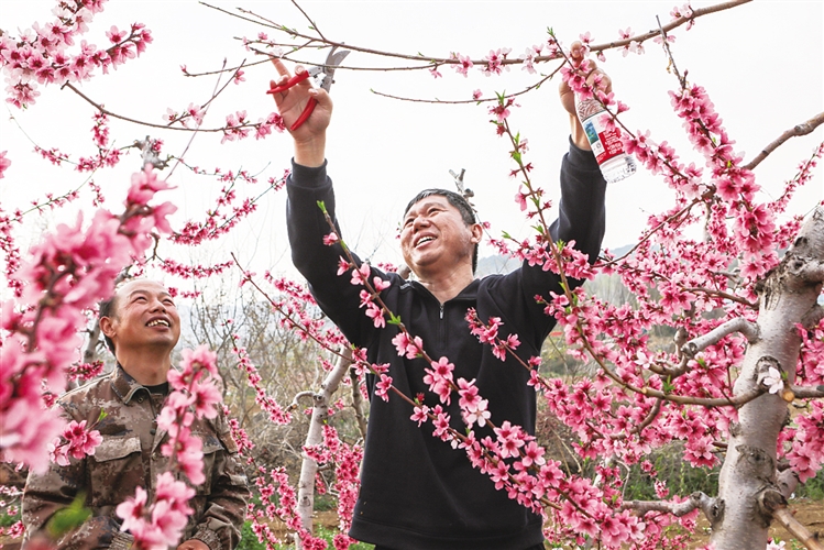 近日,淄川区太河镇北岳阴村的桃花竞相绽放,迎来盛花期。该村联合淄川区农业农村局等单位及社会组织,在“咱家蟠桃荟”家庭农场共同举办“科技文化联金融、相约岳阴桃花红”乡村振兴主题活动,通过农技现场指导、金融政策宣讲、文化文艺展演等多种形式,精准赋能特色产业发展,为乡村振兴注入新动能。图为农技人员为桃农现场讲解桃树管护技术。