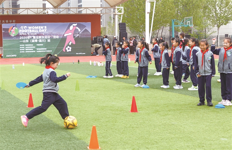 为推动女子足球运动普及与发展,4月9日,由亚足联、中国足协主办的2026年“亚足联女足日”活动——山东(淄博·淄川)站在淄川经济开发区实验学校举行。亚足联女足日又称“女孩足球节”。活动现场,近200名女学生在专业指导员带领下积极参与趣味足球游戏,在绿茵场上奔跑嬉戏、挥洒汗水,尽情感受足球运动的魅力与快乐。