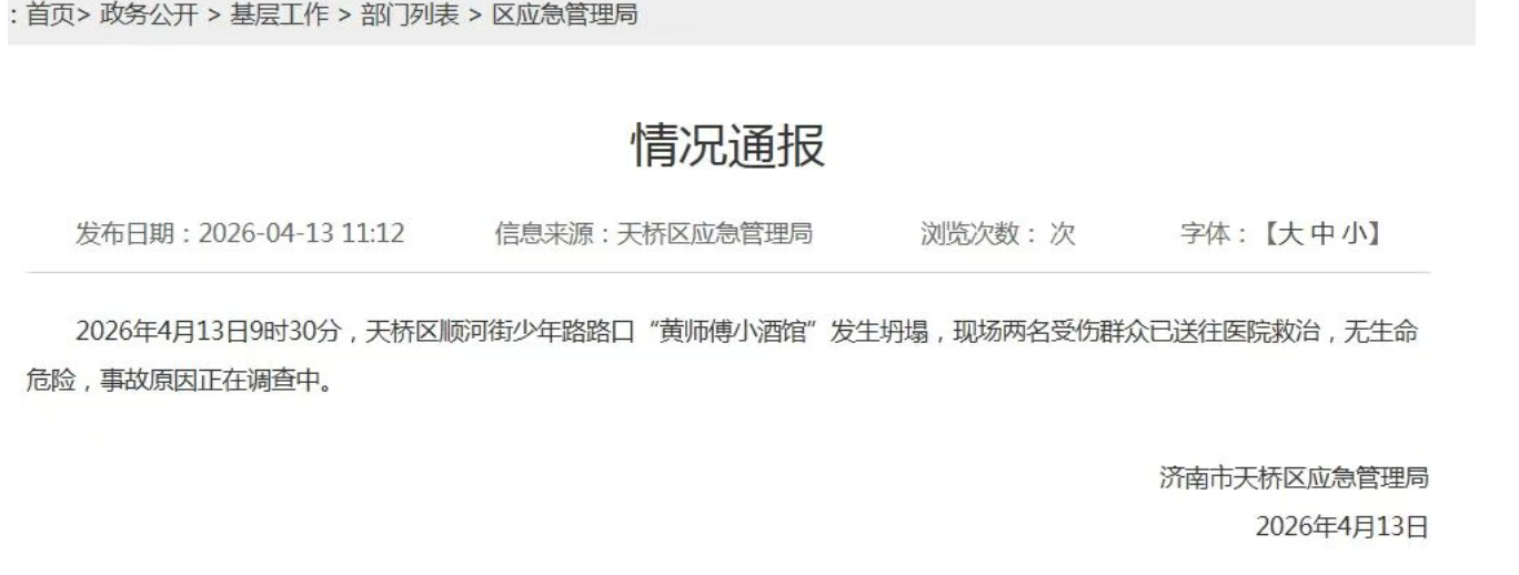 济南市天桥区应急管理局4月13日通报:2026年4月13日9时30分,天桥区顺河街少年路路口“黄师傅小酒馆”发生坍塌,现场两名受伤群众已送往医院救治,无生命危险,事故原因正在调查中。(大众新闻记者孙业文)