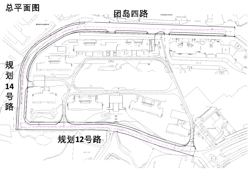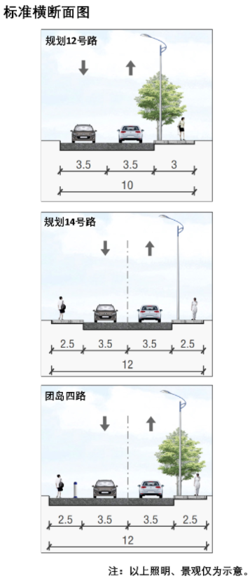 本项目包含规划12号路、规划14号路、团岛四路,道路全长约600米,道路等级为城市支路。具体来看,规划12号路道路长约228米,规划道路红线宽度10米,双向两车道;规划14号路道路长约183米,规划道路红线宽度12米,双向两车道;团岛四路道路长约189米,规划道路红线宽度12米,双向两车道。