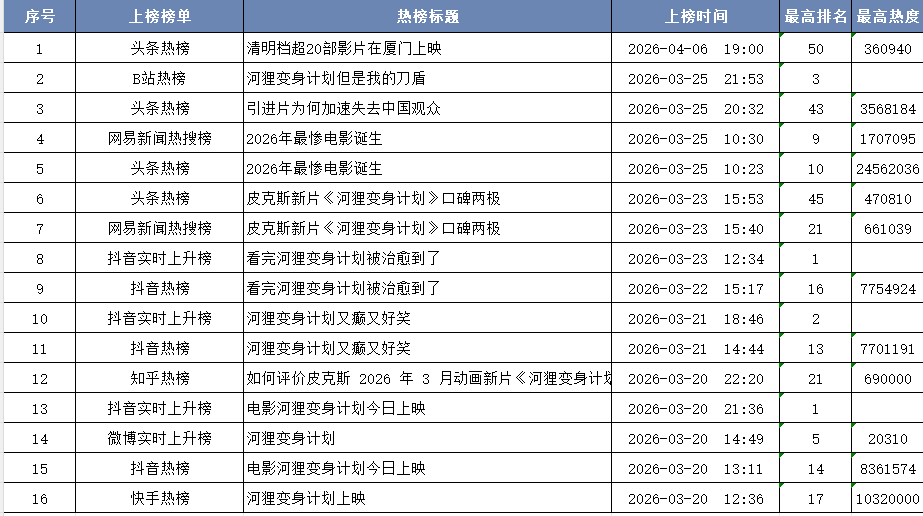 齐鲁蛙眼舆情大数据平台显示,自2026年3月20日至4月10日,关于影片《河狸变身计划》全网信息量约20万条,形成16次话题热搜。