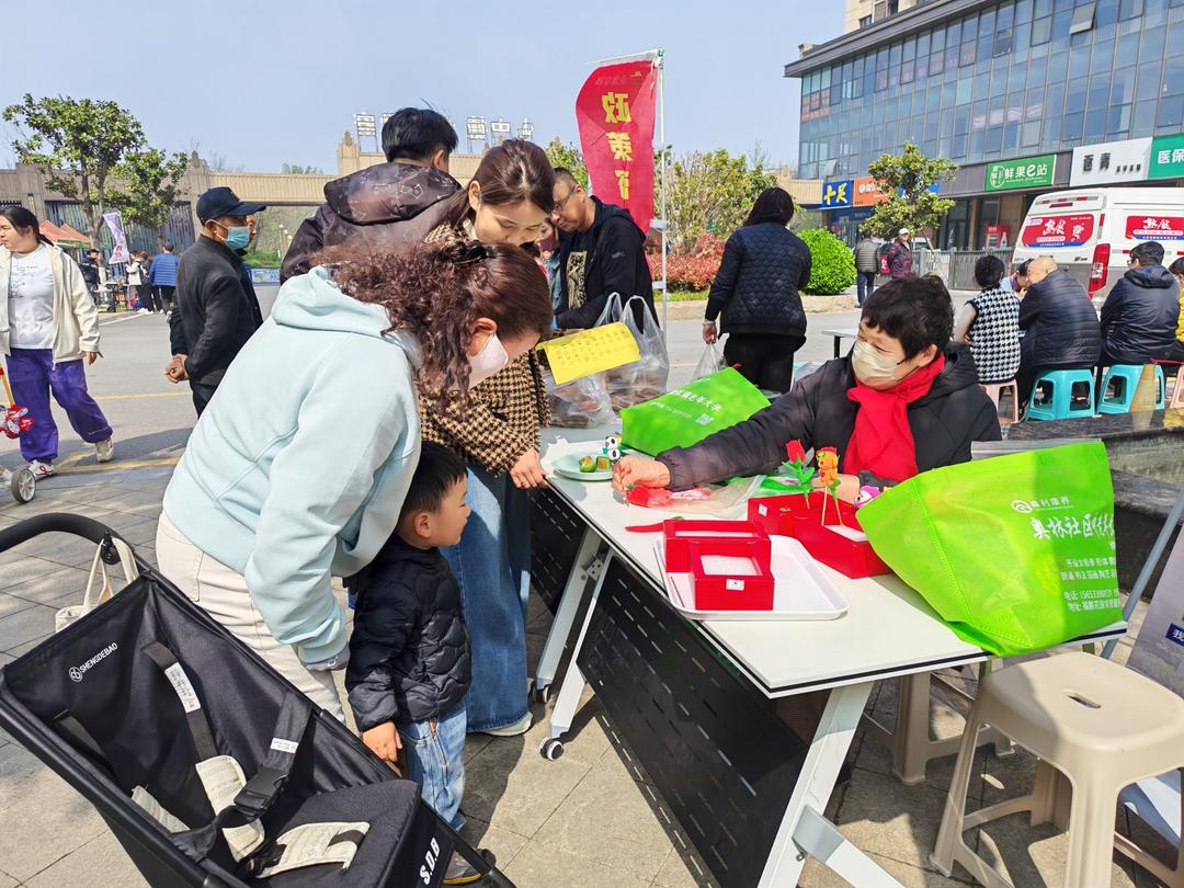 活动尚未开始,新鲜的瓜果蔬菜、各类调味品、手工面条和家常熟食便已摆放整齐,吸引了不少早到的居民。“比去超市还便捷,关键是新鲜又实惠。”正在挑选西红柿的李大姐说道。一旁的文化角里,社区钩织达人带来的杯垫、玩偶精致可爱,面塑师傅手指灵动,一只只小动物栩栩如生。不少居民看得入神,索性停下来现场学习。