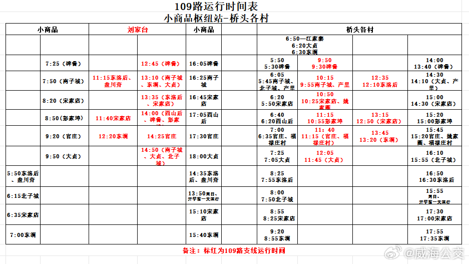 新开通109路支线运行时间:刘家台村委11:15—14:50;桥头枢纽站9:50—13:45。执行普通线路票制票价,线路等级为三级,享受优惠换乘政策。