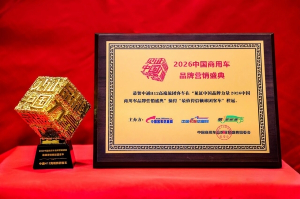 近日,“2026中国商用车品牌营销盛典”在北京举行。山东重工所属中通客车H12、N12两款车型分别获“最值得信赖旅团客车”和“新能源客车出口畅销车型”两项奖项,彰显了中通客车的产品实力与品牌影响力。