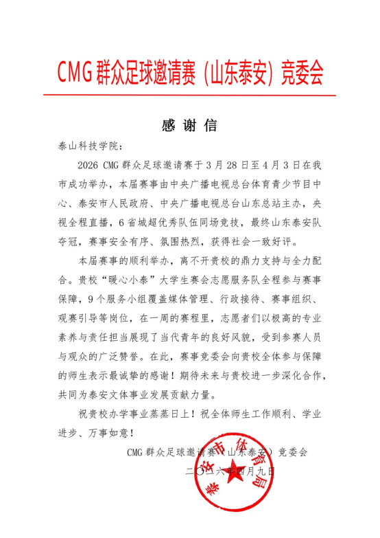 近日,泰山科技学院“暖心小泰”大学生赛会志愿服务队收到CMG群众足球邀请赛(山东泰安)竞委会发来的感谢信。竞委会对学校在CMG群众足球邀请赛中所提供的鼎力支持表示衷心感谢,并对志愿者在志愿服务工作中展现出的专业能力和高度责任感给予充分肯定。