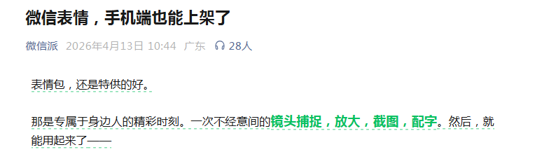 4月13日,微信派公众号发文称:微信表情,手机端也上架了。