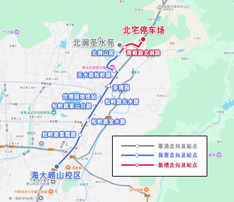 主站由北涧圣水苑调整为北宅停车场,副站海大崂山校区,调整后为:北宅停车场—海大崂山校区。