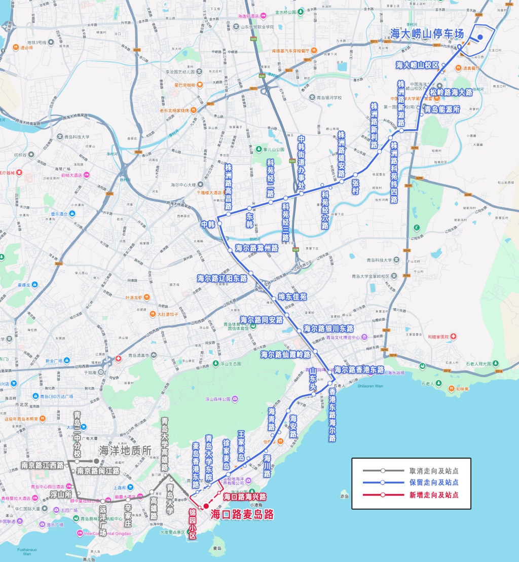 主站海大崂山停车场,副站由海洋地质所调整为海口路麦岛路,调整后为:海大崂山停车场—海口路麦岛路。